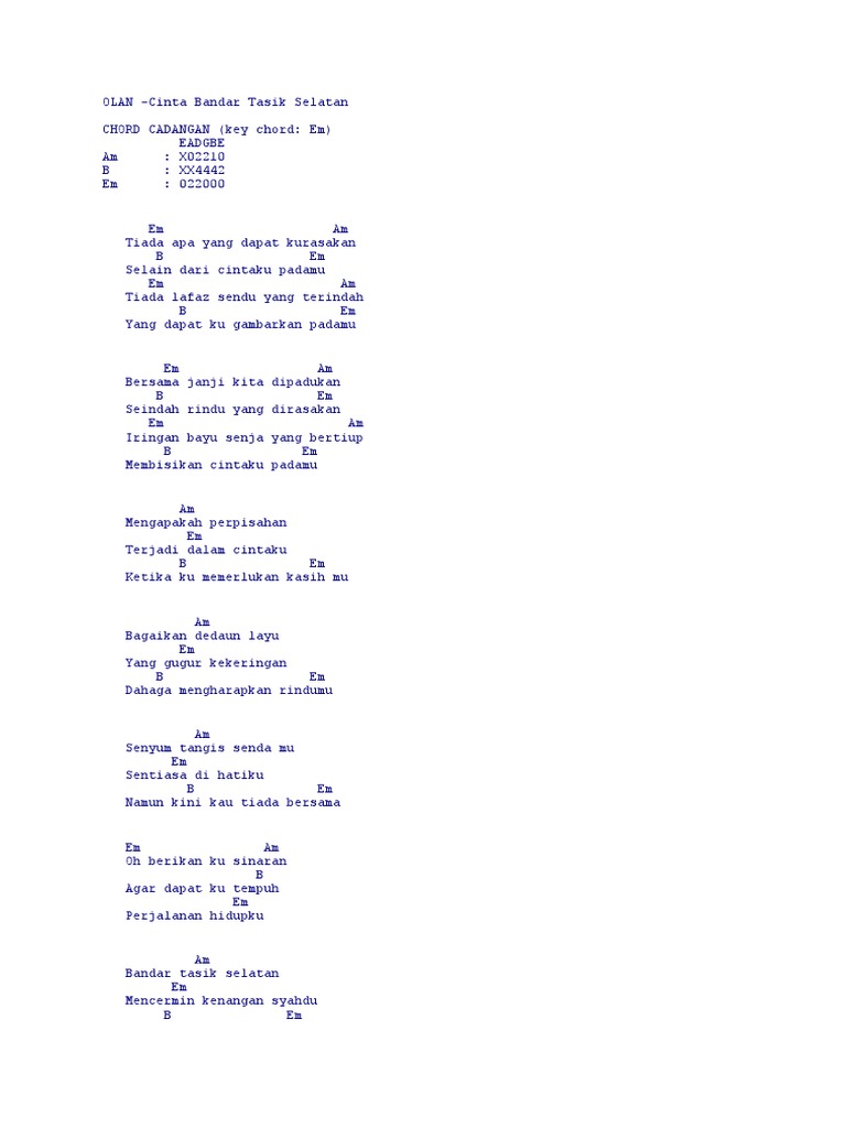 Cinta Bandar Tasik Selatan Tiada apa yang dapat kurasakan Selain dari cintaku padamu Tiada lafaz sendu yang terindah Yang dapat kugambarkan padamu Bersama janji kita padukan Seindah rindu yang dirasakan Iringan bayu senja yang bertiup Membisikkan cintaku padamu Mengapakah perpisahan Terjadi dalam cintaku Ketika ku memerlukan kasihmu Bandar Tasik Selatan Mencermin kenangan syahdu. Kunci Gitar Olan - Cinta Bandar Tasik Selatan 17 Nov 2017 Em Am Tiada apa yang dapat kurasakan. E Am yang dapat kugambarkan.